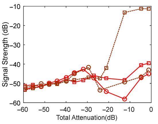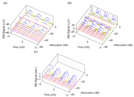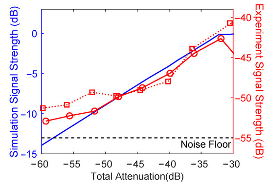 Similarly, we could generate simulated SM waveforms (in this case, we used parameters to match with the 852 nm DFB laser) with different optical feedback by using Equations (1)–(3) to synthesise the terminal voltage. The AC component of the waveforms was able to generate waveforms sitting in the SM regions where the cavity attenuation was varied from −60 to −30 dB. The laser was observed entering a coherence collapse regime when the attenuation was above ∼−30 dB. The simulated SM signal shown in Figure 4c matched well with the experimental result for each attenuation level at the same regime in Figure 4a,b. Some minor differences appeared in the morphology of the signals in the strong feedback regime; as mentioned earlier, these difference could have been due to spatial coupling effects, which was further reinforced, as these were not present in the 1D model used in the simulations. The normalised signal strength of the SM signal as a function of total attenuation for the same laser was simulated and is shown with a blue curve in Figure 5, which also agreed well with the experimental result, as shown in the red curves in the figure. The shown noise floor was estimated from the average value measured from the two lasers well below the threshold. Both experimental curves seemed to plateau before this point, which may have been due to the peak-to-peak method of estimating signal strength. Figure 4a,b show SM fringes at the highest attenuation level ( dB) even though the noise was dominant. This noise was most likely a combination of the effect of feedback, diode junction, laser driver, thermal and amplifier noise, and the effects from light coupling, which was not exactly as expected. This matched well with previously observed effects with THz QCLs, and the SM signal should be able to extracted using techniques that could extract signals from a signal-to-noise ratio of less than 1 (see [24]). Alternatively, using a photodiode to monitor the signal would also help in this regard, as the SM voltage signal tends to have a higher noise floor (typically in the order of ∼10 dB [70]).