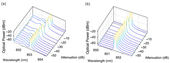 Laser spectra for different feedback levels (attenuation) for a static target. (a) VCSEL spectrum at a bias current of 7 mA and laser temperature of 35 C. (b) DFB spectrum at a bias current of 70 mA and laser temperature of 25 C.
