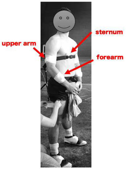 Illustration of sensor placement on the forearm, upper arm, trunk, and feet. The trunk sensor was placed on the sternum at the level of the xyphoid process, the upper arm sensor was placed at the posterolateral portion of the distal one-third of the segment, and the forearm sensor was placed at the mid-point of the segment. Placement location on each segment was determined by comfort for the pitcher and the location that appeared to produce minimal migration due to muscle contraction across multiple pitches. Arm and foot sensors were secured with flexible adhesive tape, while the trunk sensor was held in place by a snug chest strap.