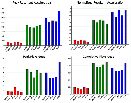 - Bullock, G.S.; Schmitt, A.C.; Chasse, P.; Little, B.A.; Diehl, L.H.; Butler, R.J. Differences in PlayerLoad and pitch type in collegiate baseball players. Sport. Biomech. 2019, 20, 938–946. [Google Scholar] [CrossRef] [PubMed]