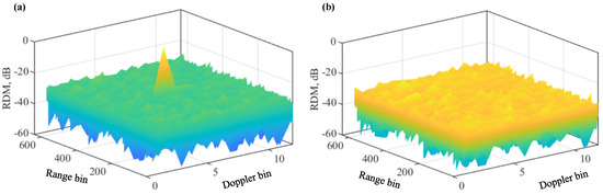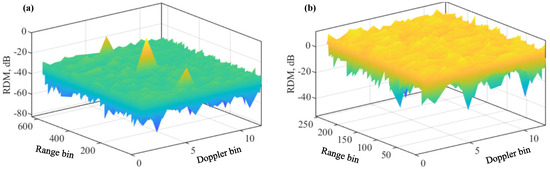 RDM of Algorithm 3 in (a); RDM of Algorithm 4 in (b). A single target is set here. Please note that the symbol “-” before all numbers, as automatically generated by MATLAB during plotting the figure, denotes the negative sign.