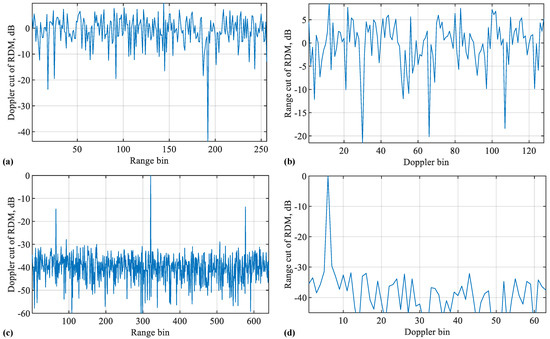 Figure 2 plots the range and Doppler cuts of the RDMs obtained in Figure 1. Given the sample delay , the range bin (in the sensing receiver, each OFDM symbol is uniformly sampled. Each of the sampling times represents a different range increment and is often referred to as a range bin [39]) index for USF is L (starting from one here to comply with MATLAB). For COS, since the overall number of samples along the range bin is N, smaller than L, a modulo-N of L, i.e., here, is taken as the range bin index for COS. The Doppler bin (similar to the range bin, the DFT of OFDM symbols at the same range bin leads to the Doppler domain. Each discretisation grid in the Doppler domain is termed as a Doppler bin) index can be calculated as , where rounds the enclosed term, “” is because the index starts from one, for COS, and . Here, is the number of columns of obtained in Step 1 of Algorithm 1. According to Definition 1, we have .