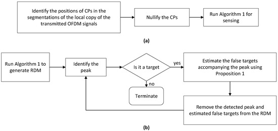 We proceed to design new methods for removing false targets. Two solutions are provided in this section. Their block diagrams are illustrated in Figure 3. The first solution, as developed in Section 5.1, seeks to remove the false targets completely by preventing them from being generated. This is mainly achieved by the first two steps shown in Figure 3a. The second solution allows the false targets to happen and then employs their features unveiled in Proposition 1 to remove them. The block diagram of the second solution is given in Figure 3b, with details of the solution illustrated in Section 5.2.