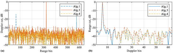 (a) Doppler cuts of the RDMs shown in Figure 4; (b) range cuts of the same RDMs. Note that Algorithm 1 as developed in [32], is simulated as a benchmark. It suffers from the false target issue. In contrast, the new algorithms, Algorithms 3 and 4, are able to remove the false targets. Please note that the symbol “-” before all numbers, as automatically generated by MATLAB during plotting the figure, denotes the negative sign.
