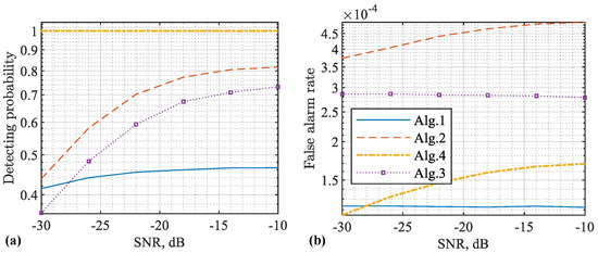 Detecting performance versus SNR (with respect to ), where a single target is set with randomly generated parameters over independent trials. The detecting probability is given in (a) and the false alarm rate is given in (b). Note that Algorithms 1 and 2, as developed in [21,32], respectively, are simulated as benchmark methods. Additionally note that Algorithm 2 [21] cannot properly sense a target with the echo delay over the CP duration, and hence its detecting probability is much lower than our algorithms. Please note that the symbol “-” before all numbers, as automatically generated by MATLAB during plotting the figure, denotes the negative sign.