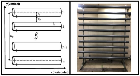 We designed a crowded pipes model as in Figure 2. It was created by modeling the crowded pipes of an actual plant. In this model, p pipes of radius are arranged horizontally, and the distance between adjacent pipes is . We make the direction parallel to the direction of pipes horizontal and perpendicular to the crowded pipes vertical, and the moveable distance in the vertical direction is .