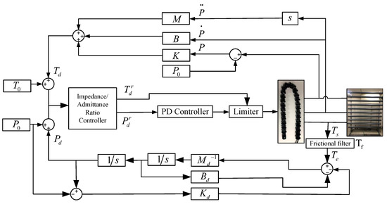 The closed-loop control of the force–position hybrid control consists of an impedance controller and an admittance controller. The impedance controller generates different desired torques based on the position error generated by the environment for the torque control. The admittance controller generates different desired positions based on the motor’s feedback torque for the position control. Each system is a decentralized control system at the joint level and does not use Jacobi matrices, which reduces the computational effort to some extent. A block diagram of the system dynamics for each joint is shown in Figure 3.