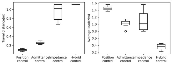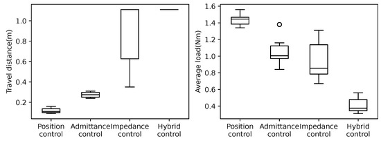 The pure position control uses the position control mode of the Dynamixel. The Dynamixel’s current-based position control mode is used in the other three controllers. The admittance control is achieved by setting the impedance/admittance ratio factor r to 0. Similarly, the impedance control is achieved by adjusting the impedance/admittance ratio factor r to 1. For the hybrid admittance/impedance control, r is set to as the value determined by trial-and-error tuning. In the experiment, the robot was placed in the same initial position and moved using each control strategy. The experiment ended when the robot reached the bottom or top of the crowded pipes or when the Dynamixel detected a persistent load that exceeded the maximum output and resulted in an overload error condition. For each controller, 10 moves were conducted in the upward direction and 10 in the downward direction, for a total of 20 trials. For each position control function, the target angle is given by Equation (1) in Section 3. The parameters for the admittance control, impedance control, and hybrid impedance/admittance control are shown in Table 3, and the same values are used except for the adjustment ratio factor r. As the experimental results, the travel distance and motor load for the four cases moved upward and are shown in Figure 5. The travel distance and motor load of the four cases moved downward and are shown in Figure 6. Note that the motor load is the average load of all the motors. The travel distance of each case was measured by the head position of the snake robot. The maximum moving distance of the snake robot in the experiment’s environment was [m], and the travel of [m] indicates that the robot was able to move through the entire crowded pipes. A large variance in the travel distance indicates that the robot is not performing consistently. Additionally, a large motor load also indicates that the robot is subjected to more external forces. Moreover, a large variance in the motor load indicates that the robot is not performing consistently. Figure 5 and Figure 6 show that the hybrid control strategy always moves through all the crowded pipes, and the motor load and its variance are small compared to the other controllers.