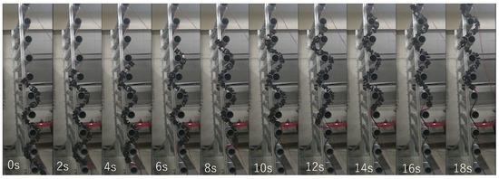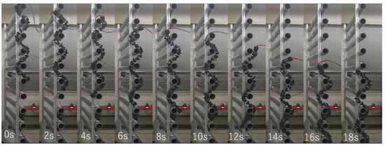 In addition, the travel velocity of the robot with the hybrid control is shown in Figure 11. The average values are [m/s] and [m/s] for the upward and the downward movement, respectively. An example of the sequential pictures of the upward and downward movements of the snake robot with the hybrid control is shown in Figure 12 and Figure 13, respectively. The travel velocity of all 20 experiments exceeded that of the literature [14], and no motor reset occurred. The results verified the effectiveness of the hybrid controller proposed in this study and solved the motor reset issue in the literature [14] when the snake robot traveled in the vertical direction.