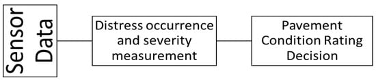 Two vital elements of road pavement (referred to as pavements in the rest of this paper) management are inventory management and periodic condition evaluation; both are used to set future priorities for pavement construction management and maintenance. In this paper, pavement refers to hard surfaces used for motor vehicles. A complete pavement management system consists of inventory data collection (i.e., width, length, shoulder, and pavement type) and pavement characteristic assessment, i.e., (roughness (ride), surface condition (distresses), surface skid resistance, pavement strength, and deflection). The current pavement networks, including motorways across a country, are developed and modernized over centuries. The construction, width, and length of a pavement depend on the traffic it will carry and the type of connection it will make. They are classified into different categories; for example, in Ireland, they are classified as motorways, national primary, national secondary, regional roads, and local roads [1]. A common way to periodically evaluate surface condition, including distresses on a pavement network, is for the civil authority to conduct a visual surface condition assessment and a ride smoothness test. Surface condition is assessed through visual surveying and usually consists of three steps: (1) pavement condition data collection, (2) distress identification and quantification, and (3) assigning a pavement rating index to a stretch of a pavement using a standard rating scale (e.g., pavement surface evaluation rating-PASER [2]) that is typically localized to a specific geographical region [3]. Figure 1 gives a complete picture of the three-step process. The data collection is followed by distress occurrence, severity measurement, and pavement condition rating decisions.