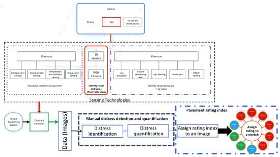 Different sensing technologies, sensing positions, and vehicles have been used to capture data to assess pavement conditions. The choice of technology depends on economic factors, availability of resources, and pavement characteristics to be measured [4,34]; the sensor’s position depends on the sensing technology used to acquire data for pavement condition assessment [18,26]. Figure 2 lists three types of sensing technologies available for structural monitoring and distress detection that can be integrated into vehicles with a GPS.