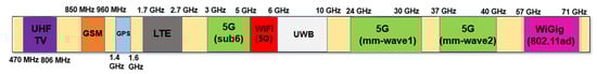 A mixer is a key component that converts the radio frequency (RF) at the frontend of a communication system. At the transmitter, the mixer up-converts the frequency of a signal from an intermediate frequency (IF) to an RF, and at the receiver, it down-converts the frequency in reverse. Recently, with the commercialization of fifth-generation (5G) communication, many RF chains have been integrated into an antenna module as array antennas have been adopted for beamforming purposes [1,2]. Figure 1 shows a block diagram of a 5G antenna module commonly used in a mobile handset or base station. As shown in Figure 1, it is important to reduce power consumption as there are many chains due to the array type. This requirement applies to not only power amplifiers, which traditionally account for a significant portion of power consumption, but also receivers that must always be waiting to receive data. In addition, as various frequencies are used for many communication services, many transmitter/receiver modules operating at each frequency are required. Figure 2 shows the frequency spectrum distribution in commercial use today [3]. As the demand for mobile handsets increases, it has come to a situation in which a single user equipment has to support various communication services. Therefore, the demand for a wideband transceiver capable of covering multiple frequency bands with a single module or integrated circuit is increasing. For example, almost all Wi-Fi devices used in homes or public places now have a built-in chip capable of 2.4 GHz/5 GHz dual-band communication.