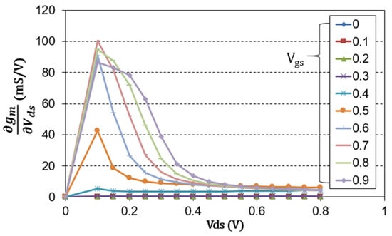 Simulated derivative of gm with respect to Vds according to Vgs and Vds.