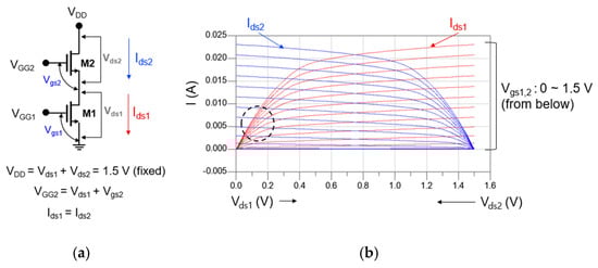 Figure 4a,b show the circuit schematic of the cascode mixer and DC-IV of each transistor constituting the cascode structure, respectively. As shown in Figure 4a, each transistor constituting the cascode cell should share the same current under a fixed drain voltage (VDD). In Figure 3, the bias of M1 favorable to designing the drain mixer was Vds = 0.15 V and Vgs = 0.7 V. Therefore, even if the total VDD is 1.5 V, it is sufficient for M2 to operate as an IF amplifier.