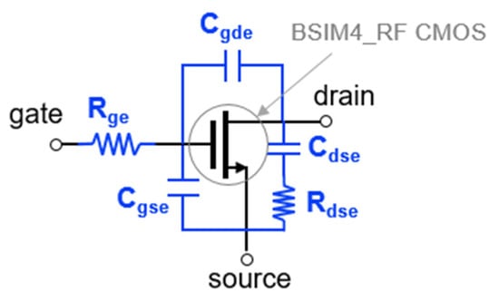 For the mixer simulation, the BSIM4 RF CMOS model provided by the foundry is basically used [30]. But when the S-parameters of the foundry model were compared to the measured data, it was still inaccurate at high frequencies. We composed a macro model by adding external parasitic parameters in the BSIM4 RF model. Figure 5 shows the macro model of RF CMOS used in this work. Using the macro model, S-parameters and a drain current at active bias are simulated for each transistor size. Figure 6a,b show the simulated S11 and S21 on the Smith chart. The smaller the size of the transistor, the smaller the power consumption, and the smaller the input parasitic capacitance, so that a high-frequency mixer operation is possible. However, since the gm becomes small, it is disadvantageous to the conversion gain. Therefore, it is necessary to determine the size of the transistor by comprehensively considering the maximum operating frequency, conversion gain, and power consumption. The stage number can be analyzed using common-source gain cells similarly to the method proposed in [12]. Table 1 compares the simulated 3-dB cutoff frequency (Fcut-off) according to the stage number.