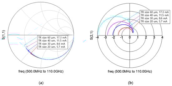 Comparison of (a) S11 and (b) S21 according to transistor (TR) size with current consumption.