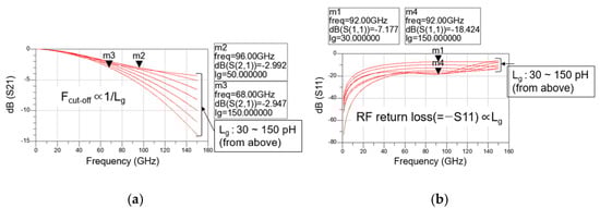 Moreover, as determined in the previous section, the transistor size is fixed to 30 μm and the total number of stages is fixed to three. As shown in Figure 7a, as the line inductance increases, the loss increases at high frequencies, so the Fcut-off decreases from 96 GHz when Lg is 50 pH to 68 GHz when Lg is 150 pH. However, Figure 7b shows that as the line inductance increases, it is combined with the parasitic capacitances of the transistor, and the RF return loss improves further in the broadband. When Lg is 30 pH, it is about 7 dB at 92 GHz, but when Lg is 150 pH, it increases to about 18.4 dB at 92 GHz. Therefore, it is necessary to select an appropriate Lg value considering both Fcut-off and RF return loss. In this study, 120 pH is selected as the gate line inductance, and the gate line length and drain line length are designed accordingly.
