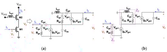 To further improve the CG at high frequencies, positive feedback using an inductor can be applied to the cascode structure [10,31]. In the cascode structure, the positive feedback can be divided into two types. One is adding an inductor to the gate of the upper transistor, and the other is adding an inductor to the source-drain connection between transistors. The inductors used here help improve the bandwidth by suppressing the decrease in gm of the entire cascode cell at high frequencies. For each of the two cases, we will analyze them mathematically using the equivalent circuit of the cascode structure.