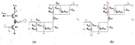 Figure 9a,b show the transistor equivalent circuits of the cascode mixer when the second positive feedback inductor (Lp2) is added to the source-drain connection between M1 and M2. In a similar way as before, the Z21 calculated through node analysis of the equivalent circuit in Figure 9b is