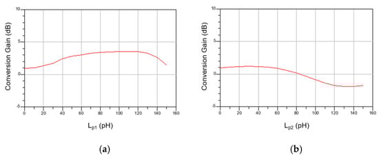 Figure 10a,b show the simulated CG according to the values of Lp1 and Lp2 at high frequency. As expected from Equations (2) and (7), CG changes according to the values of Lp1 and Lp2, and the optimal CG is shown when Lp1 = 120 pH and Lp2 = 30 pH. Although we did not calculate the equation when both inductors are simultaneously included because the formula becomes very complicated, some tuning is required. This can be readjusted from the initial value through simulation. However, it did not change much.