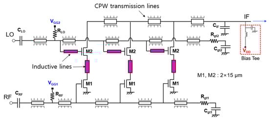 The distributed mixer consists of three stages, and both M1 and M2 of the cascode cell use a 2 (number of gate fingers) × 15 μm (unit gate finger width) n-channel enhancement-type metal-oxide-semiconductor (NMOS). The RF and LO signals are distributed to each cascode mixer cell through the gate lines of M1 and M2, respectively. Then, the RF signal is applied to the gate of M1, the LO signal is applied to the gate of M2, and the IF signal is output to the drain of M2. The IF signal is summed and output through the drain lines of each cascode mixer cell. Both the gate line and drain line are designed as a coplanar waveguide (CPW)-type transmission line with low high-frequency loss and are easy to implement in a monolithic microwave integrated circuit (MMIC), and the line length is adjusted according to the inductance calculated in the previous section [10]. To implement inductive feedback, narrow inductive lines are added to each node of the cascode cell as shown in the colored part in Figure 11. Actually, as shown in Figure 10b, since the optimum value of Lp2 is as small as 30 pH, it is implemented as a thin and short line connecting the drain of M1 and the source of M2. CRF and CLO are used as DC block capacitors, and CIF is connected to the shunt to filter the RF or LO signal and pass the IF signal. By using RRF and RLO resistors, the gate biases of VGG1 and VGG2 of each transistor are supplied through the gate lines. RF gate lines and LO gate lines are terminated respectively with Rgt1, Cgt1 and Rgt2, Cgt2 for wideband matching. The VDD is designed to be supplied by connecting an external bias tee to the IF port.