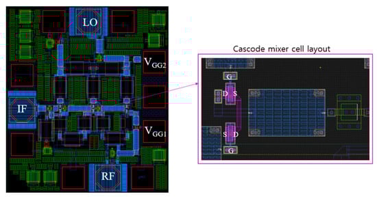 Figure 12 shows the distributed cascode mixer layout according to the schematic in Figure 11. In the center of the layout, three cascode mixer cells are included. For a compact layout, the transistors of the cascode mixer are placed facing each other as shown on the right side of Figure 12, and the drain and source directions are reversed so that the drain line can be exited through the center. At this time, metal vias are used for the line-to-line connection and transistor-to-transistor connection, and parasitic inductance and parasitic capacitance due to this can affect the high-frequency performance. It is necessary to reflect this effect in the simulation and examine the sensitivity according to the actual layout. The sensitivity variables are the transistor model variation, parasitic inductance by via interconnection near transistors, and the presence or absence of a tie-down diode added to satisfy the antenna rule. We simulated the conversion gain in each case and compared the variation of CG to see if there are any critical factors in performance. As a result, the CG decreased by up to 5 dB at frequencies above 60 GHz depending on the combination.