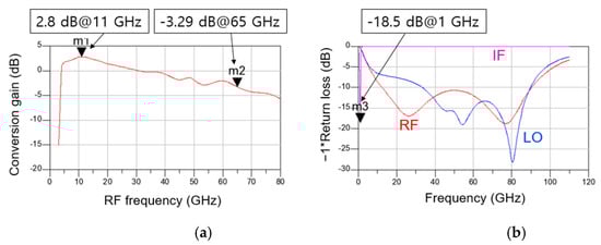 Figure 13a,b show the simulated CG and return loss according to frequency of the distributed cascode mixer, respectively. The simulation conditions are −30 dB for RF power, 4 dBm for LO power, 1.5 V for VDD, and 0.7 V for VGG1 and VGG2. The IF is set near 1 GHz, and the IF matching is implemented by connecting an external 30 nH inductor in series so that the chip size does not increase. As shown in Figure 13a, the CG is approximately −3 to 3 dB from 4 to 65 GHz. A peak value of 2.8 dB is obtained at 11 GHz, and the CG is the lowest at –3.29 dB at 65 GHz. As shown in Figure 13b, the RF return loss is more than 10 dB from approximately 12 to 90 GHz, and the LO return loss is more than 10 dB from approximately 30 to 90 GHz. The IF signal shows the return loss of 18.5 dB at 1 GHz.