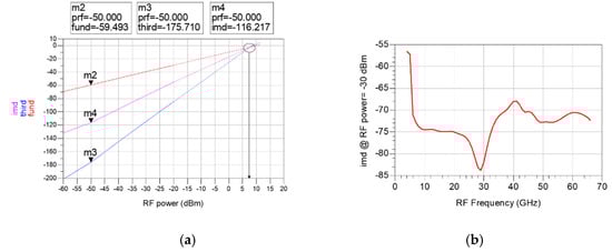The third input intercept point (IIP3) is simulated to examine the linearity of the designed mixer. IIP3 can be calculated through the third-order intermodulation distortion (IMD3) output by applying a two-tone RF signal with an interval of 10 MHz. Figure 14a shows the fundamental signal (fund), IMD3 signal (third), and the difference (imd) between the two signals obtained from the power sweep of the two-tone RF signal at 20 GHz. As shown in Figure 14b, IIP3 can be calculated from the simulated imd. The calculated IIP3 is about −2 to 12 dB from 4 to 66 GHz. Unfortunately, IIP3 was not measured because the measurement is not equipped.