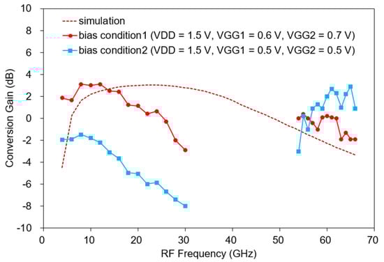 Figure 17 shows the measured CG versus RF frequency of the fabricated mixer. The fabricated mixer is measured under two bias conditions. The bias condition 1 is VDD = 1.5 V, VGG1 = 0.6 V, and VGG2 = 0.7 V and the bias condition 2 is VDD = 1.5 V, VGG1 = 0.5 V, and VGG2 = 0.5 V. The supplied RF power is −30 dBm, the LO power is 8–10 dBm, and the IF is 650 MHz. To obtain an optimal CG, the bias is slightly tuned, and the measured IF is slightly down-shifted by changing the matching element value. Moreover, the LO power is increased compared with the simulation result, which is presumably because the gate resistance of the transistor model used was underestimated in the simulation. In general, the larger the gate resistance, the more LO power is required [32,33]. Under bias condition 1, the measured CG is −2.9–3.1 dB at 4–30 GHz as shown in Figure 17, and at 54–66 GHz, it is −1.9 to 0.4 dB. The total DC current is 6–8 mA. Measurements are omitted in some bands because our measurement setup cannot generate enough LO power from 30 to 54 GHz. Compared with the simulation result (see the dotted line in Figure 17), similar results are generally shown within 4 dB. Around 30 GHz, the CG decreases more than the simulation. The reason is thought to be that the effect of inductive feedback was overestimated during the simulation. Conversely, the CG increases more than that of the simulation at 54–66 GHz, which is considered to result from the overestimation of the loss due to the high-frequency via model.