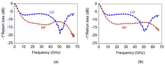 Figure 18a,b represent the measured RF and LO return loss under bias conditions of VDD = 1.5 V, VGG1 = 0.6 V, VGG2 = 0.7 V and VDD = 1.5 V, VGG1 = 0.5 V, VGG2 = 0.5 V, respectively. The return loss does not change significantly depending on the bias condition. The RF return loss shows a wideband return loss of 10 dB or more from 10 to 67 GHz, but the LO return loss is more than 10 dB from 40 to 60 GHz only. Compared with the simulation result in Figure 13b, the RF return loss is similar to the simulation result, but the LO return loss is presumed to be worse because the pole is not formed at 80 GHz owing to the actual process error and model inaccuracy.