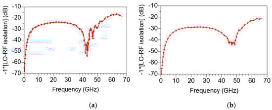 Figure 19a,b represent the measured LO-RF isolation under bias conditions of VDD = 1.5 V, VGG1 = 0.6 V, VGG2 = 0.7 V and VDD = 1.5 V, VGG1 = 0.5 V, VGG2 = 0.5 V, respectively. As shown in Figure 19a,b, the LO-RF isolation is 15 to 70 dB at 0.2–67 GHz, which is the full band of the measurement frequency. In particular, when VGG1 and VGG2 are lowered to 0.5 V, the mixer obtains the excellent LO-RF isolation characteristics of 20 dB or more in all bands.