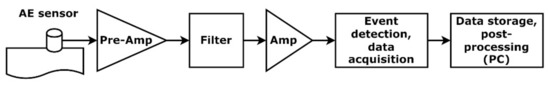 The workflow of a typical AE monitoring system is depicted in Figure 1 (top). Initially, a piezoelectric sensor converts dynamic surface motion at the transducer interface into electric signals. The signal is then amplified, firstly by the pre-amplifier embedded into the AE sensor itself or by a separate circuit, and subsequently by the main amplifier within the data acquisition unit. After amplification, signals can be filtered and then processed.