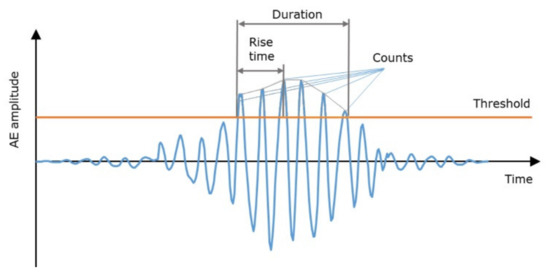 Signal processing in AE monitoring usually involves acoustic event (hit) detection. In this regard, an event is usually detected when the AE signal exceeds a preset or a floating amplitude threshold. Hit detection is typically defined by the following parameters (Figure 2): amplitude threshold; hit definition time (HDT), which specifies the maximum time between threshold crossings; hit lockout time (HLT), which is defined by the time that must pass after a hit has been detected and before the next one occurs and can be detected again; and peak definition time (PDT), which is determined by the time from hit detection to peak [20]. To further detect and analyze a defect or a process, several characteristics of the detected hits can then be extracted and used. Such parameters may include the number of hits, the hit duration, the rise time and the number of excursions over the threshold (counts).
