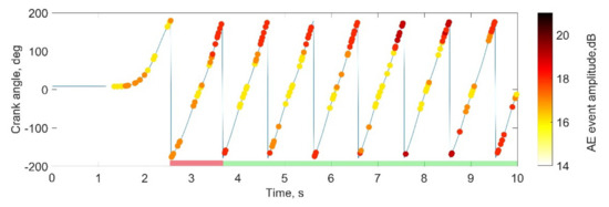 AEwin software (Mistras, Physical Acoustic) was used to obtain and export AE recordings in an ASCII format. Recordings, along with the IMU sensor orientation, were further analyzed in MATLAB (Mathworks). Firstly, AE recordings were time synchronized with motion data, and then IMU orientation was used to segment recorded signals into repetitions, with one rotation corresponding to one repetition for the cycling exercises. Synchronization of the AE and IMU signals allowed allocating hits to the respective angles of the joint and calculating the number of hits within a single repetition. An example of the synchronized signal is presented in Figure 4, with each dot corresponding to a recorded AE event and repetitions corresponding to the change of the crank angle between −180 and 180°; additionally, the amplitude of AE hit is color-indicated.