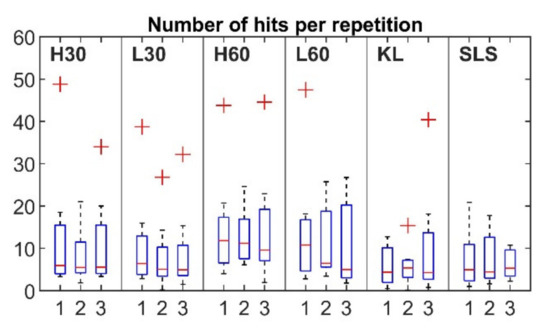 Box plot of number of hits per repetition for three sessions. Outliers are indicated by “+”.