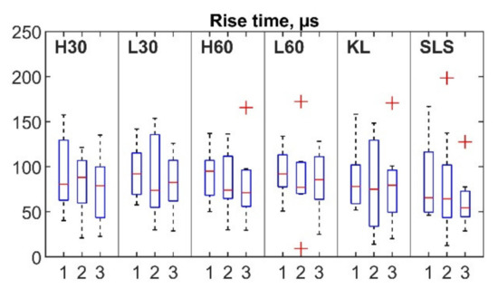 Box plot of AE hit rise time for three sessions. Outliers are indicated by “+”.