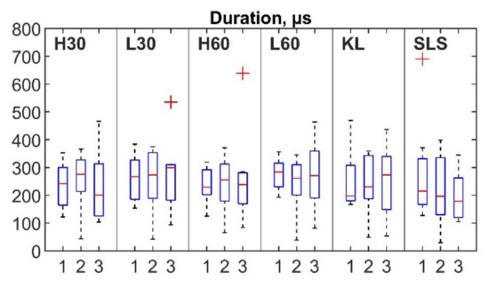 Box plots of AE hit duration for three sessions. Outliers are indicated by “+”.
