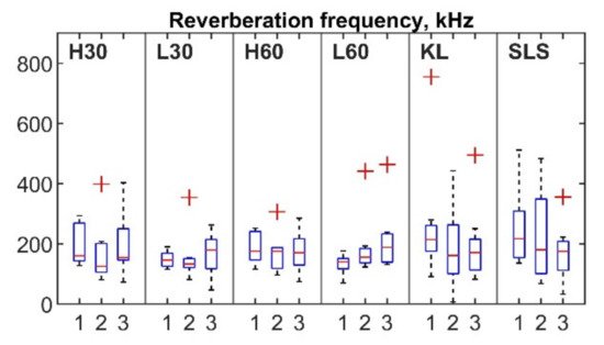 Box plots of AE hit reverberation frequency for three sessions. Outliers are indicated by “+”.