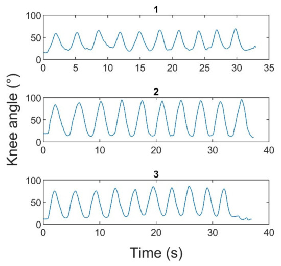 Poor inter-day reliability of the KL and SLS tasks might be attributed to the difference in exercise execution between sessions. This can be better illustrated with the example of participant 4 (Figure 9), whose knee flexion/extension angles during KL were relatively similar within the same session, with low CV values of 0.0826, 0.027, and 0.037 for the three recordings, respectively; however, dissimilar angle values were observed during different sessions (1, 2, 3) with a difference of more than 30 degrees: mean values and standard deviations of 43.33 ± 3.58°, 79.10 ± 2.13°, and 63.42 ± 2.31° for the first, second, and third sessions, respectively. Moreover, the detected joint AEs might potentially be affected by the changes in the pattern of exercise execution. For instance, phase durations of an exercise, such as lifting and lowering of the lower leg, can differ despite the use of a metronome. For example, for the same participant, the mean durations of the leg lowering phase during the KL for the first and second sessions were equal to 1.58 (±0.52) and 2.15 (±0.29) seconds, respectively, while the mean duration of leg lifting was equal to 1.41 (±0.23) and 1.52 (±0.34) seconds, respectively.
