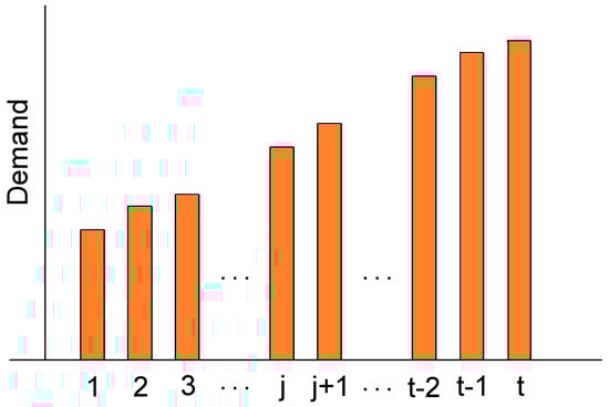 In this subsection, an approach similar to that in [] is used to sort the demands in a single contract duration. Please see Figure 2 for an example of sorting demands in a contract of duration .