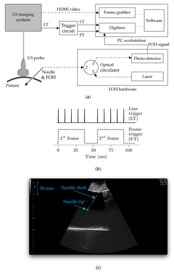 A digitizer (M2p.5961-x4, Spectrum Instrumentation GmbH, Großhansdorf, Germany) is used to acquire the voltage signal provided by the photo-detector (the “FOH signal”) with a sample rate of 10 MHz (the centre frequency of the US pulses is around 2 MHz). The US imaging system provides a “line trigger”: a voltage trigger signal synchronised to each US transmission, provided via a modified transducer cable. This voltage signal is integrated by bespoke electronics to provide a “frame trigger”—a gate signal synchronised to each US frame, i.e., each set of US transmissions used to generate a B-mode US image—as shown in Figure 1b. Both the raw and integrated trigger signals are provided to the digitizer and used to split the received signal into waveforms corresponding to each US transmission from the imaging system, and correctly group them into frames. The imaging system is also connected to a frame grabber (DVI2PCIe Duo, Epiphan Systems, Ottawa, Canada) with an HDMI cable. The frame grabber acquires B-mode ultrasound images from the imaging system, and is installed alongside the digitizer within a PC workstation. The acquired FOH signals are processed by the PC and used to superimpose a cross-hair cursor onto each acquired US image at the position of the needle tip as shown in Figure 1c.