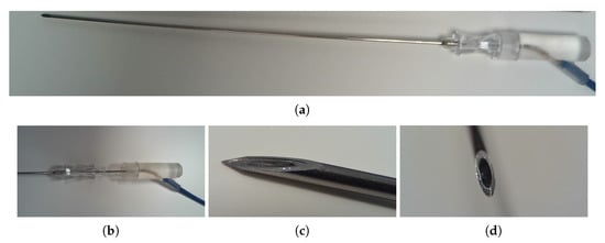 Photographs of the needle with integrated FOH: (a) needle assembly, with the stylet fully inserted into the cannula; (b) stylet partially inserted into the cannula; (c) the tip of the needle, with the stylet fully inserted; (d) the tip of the stylet.