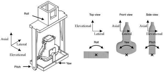 Drawing of the bespoke US probe mount allowing manual adjustment of the pitch, yaw and roll of the US probe.