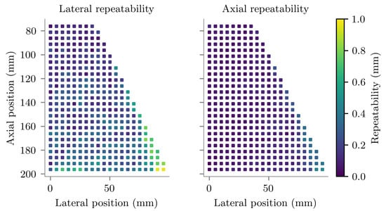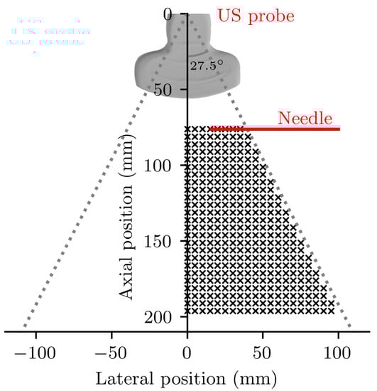 It was expected that tracking accuracy would depend on both the depth and lateral position of the needle tip within the imaging plane: the probe’s curvilinear design results in the spacing between scan-lines increasing with both depth and lateral distance from the central vertical axis of the scan plane. Tracking accuracy was therefore assessed at 356 locations within the imaging plane, equally spaced across the right-hand side plane between 40 mm and 140 mm below the probe face, forming a 5 mm resolution grid as shown in Figure 5. The fetal medicine procedure of particular interest—chorionic villus sampling—typically occurs between 11 to 16 weeks of gestation with the target located well within this depth range [50], and previous US needle tracking systems have been assessed over a similar range [30,39]. Due to physical constraints of the motion control system and hardware setup, it was not possible to laterally translate the needle across the whole field of view, but in any case tracking accuracy could be expected to be symmetrical along the central vertical axis of the probe.