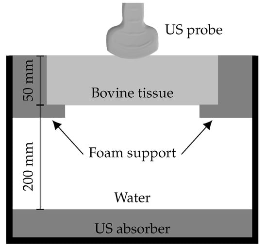 Ex vivo assessment of tracking accuracy took place in a phantom comprising a layer of room temperature bovine tissue held at the surface of a small tank of room temperature water, designed to simulate transabdominal fetal-medicine diagnostic procedures such as chorionic villus sampling and amniocentesis. A schematic diagram of the phantom is shown in Figure 6. The tissue layer was approximately 50 mm thick and the water below it approximately 200 mm deep. The base of the tank was lined with an acoustically absorbing material to prevent reflections. While the needle tip was in the water layer and therefore clearly visualised, tracked positions were compared to the apparent position of the needle tip within acquired B-mode images. The configuration of the US imaging system was identical to that used for the in vitro experiment.