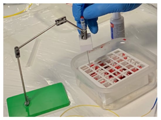 For the homogenous-medium experiment, the US probe was placed over a water tank with dimensions 70 × 40 × 50 cm. A bespoke probe mount allowed manual adjustment of its pitch, yaw and roll as shown in Figure 3. The probe was held pointing vertically downwards with its face immersed in the room-temperature water to a minimum depth of approximately 5 mm. The base of the tank was lined with an acoustically absorbing material to prevent reflections. The needle was clamped to an arm attached to a 3-axis, 2.0 m resolution computer controlled Cartesian motion system (1N150 linear stages, Thorlabs, Newton, NJ, USA) and positioned in the tank below the imaging probe. The needle was held with its long axis horizontal to the water surface, maximising the range of accessible positions within the US field of view. The needle was oriented with its bevel facing upwards, exposing the integrated FOH to incident ultrasound. The needle clamp and motion control system were positioned on the right hand side of the imaging probe, with the needle pointing left into the US imaging plane as shown in Figure 4.