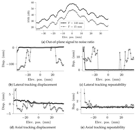 The experimental setup and alignment for the assessment of out-of-plane tracking accuracy was identical to that of the in-plane tracking accuracy assessment described above. The needle tip was initially positioned 145 mm from the probe face along the central vertical axis of the US image, and then translated elevationally to discrete positions either side of the imaging plane, and tracking accuracy was assessed at each position. The experiment was carried out with two different US imaging focal-depths: 15 mm and 140 mm, expecting that the out-of-plane tracking performance may depend the shape of the ultrasound beam profile at the needle tip depth. An FOH frame was also acquired with the US output disabled (a “noise” dataset), for determination of signal-to-noise ratio.