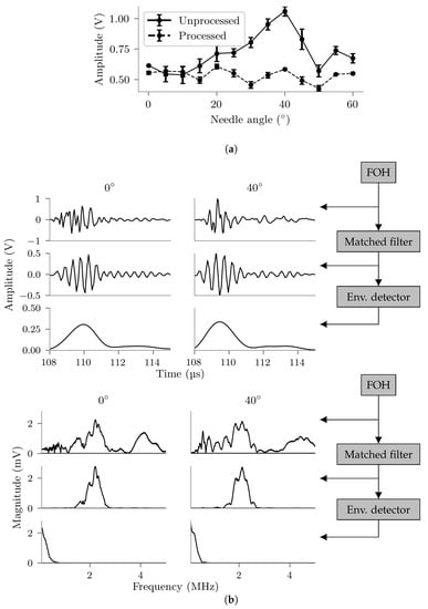 The angle of the needle relative to the probe face was found have a significant effect on the amplitude of the raw FOH signal: signal amplitude was approximately 67% higher with a needle insertion angle of 40 than 0. The shape of the directional response seen was different to what would be expected from a bare FOH [53], presumably due to acoustic interaction with the needle tip. The amplitude of processed FOH waveforms did not have a significant dependence on insertion angle. Inspection of the FOH waveforms and frequency spectra at difference stages of processing (Figure 11b) demonstrated that the additional amplitude at 40 was provided by frequency components outside of the bandwidth of the matched filter, causing the matched filter to equalise the directional response of the embedded FOH. It can be concluded that changing insertion angle does not adversely affect tracking performance.