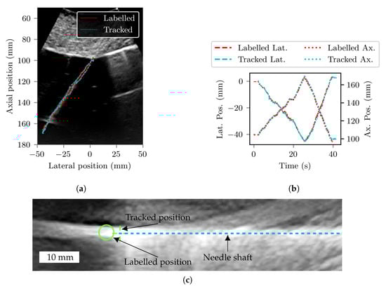 The reference and tracked positions in each frame were compared as described for the in vitro experiments, although no assessment of repeatability was possible as the needle tip moved each frame. The average distance between the tracked and reference positions across the whole dataset was calculated.