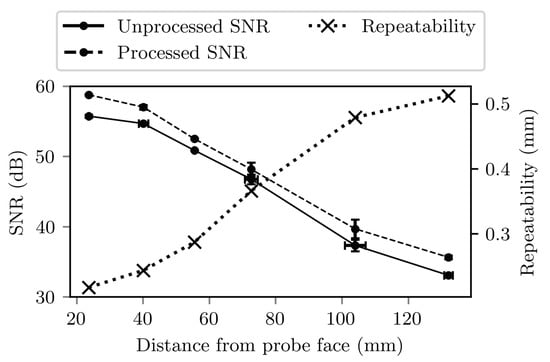 SNR was only determined for the maximum amplitude FOH waveform in each “signal” frame. The SNR was calculated by dividing the peak waveform voltage by the corresponding (i.e., raw or processed) noise level. The SNR values determined at each position were then averaged, resulting in a raw and processed SNR value for each position.